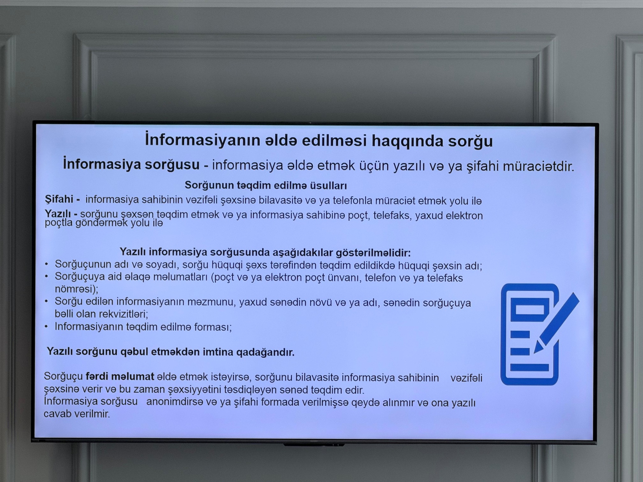 Yekunda “İnformasiya əldə etmək hüququnun müdafiəsi” mövzusunda videoçarx nümayiş etdirilib, iştirakçıları maraqlandıran suallar cavablandırılıb.